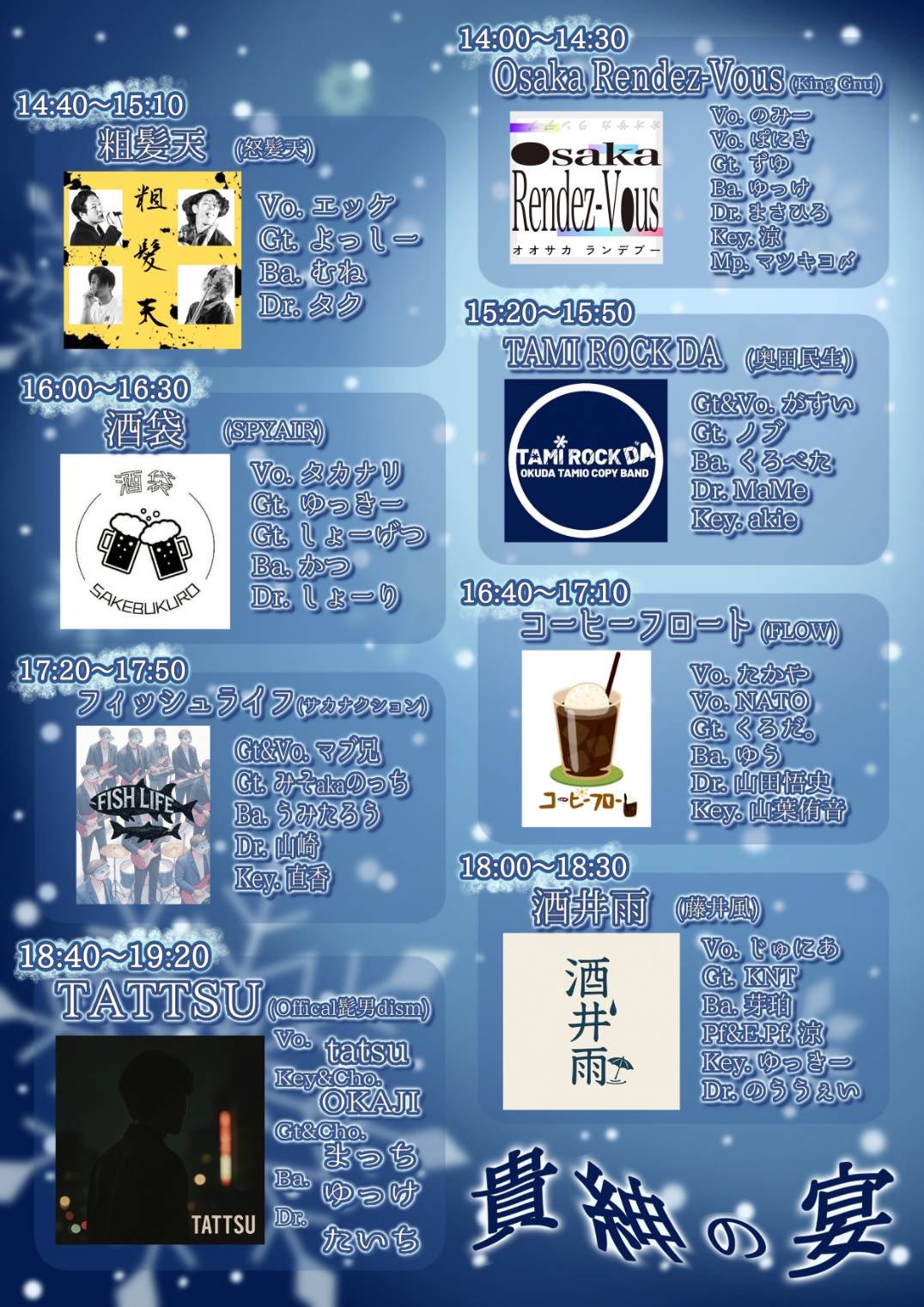 梅田 Zeela(ジーラ) スケジュール 2025.12.28(Sun) 貴紳の宴 presented by OKAJI [ACT] Osaka Rendez-Vous / 粗髪天 / TAMI ROCK DA / 酒袋 / コーヒーフロート / フィッシュライフ / 酒井雨 / TATTSU [OPEN/START] 13:30/14:00 [料金] ADV/DOOR ¥3000/¥3000 (問)梅田Zeela 06-6316-1199 http://osaka-zeela.jp
