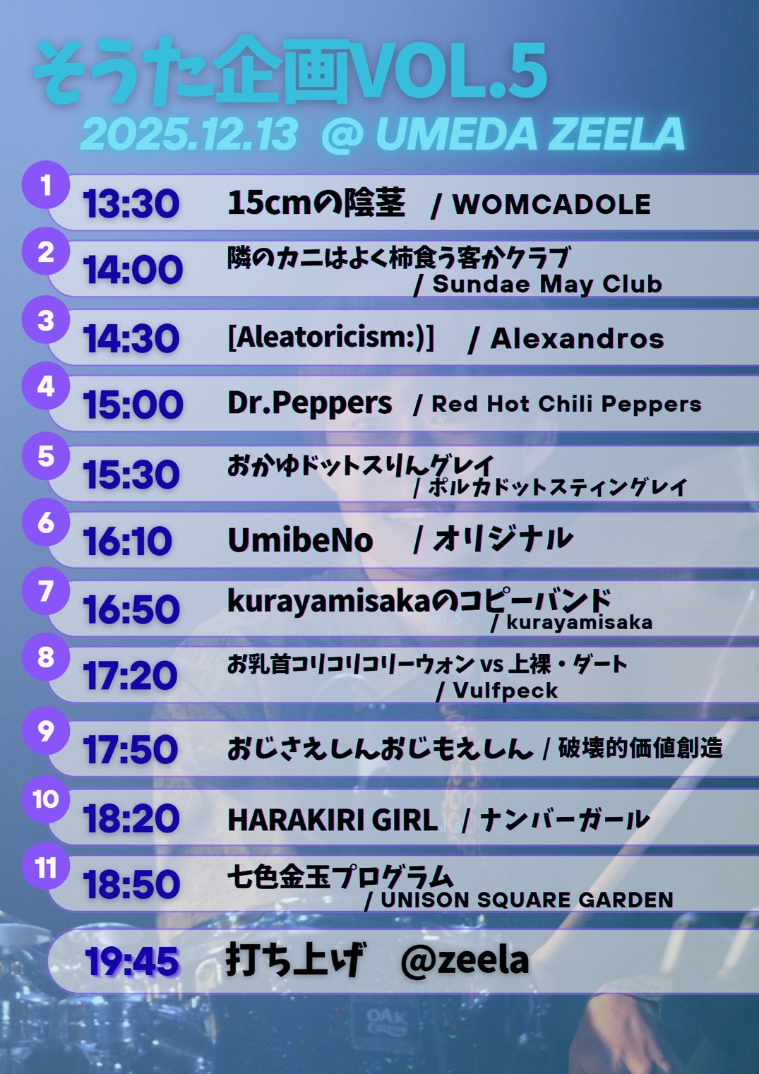 - 15cmの陰茎 / 隣のカニはよく柿食う客かクラブ / [Aleatoricism:)] / Dr.Peppers / おかゆドットスりんグレイ / UmibeNo / kurayamisakaのコピーバンド / お乳首コリコリコリーウォンvs上裸・ダート / おじさえしんおじもえしん / HARAKIRI GIRL / 七色金玉プログラム