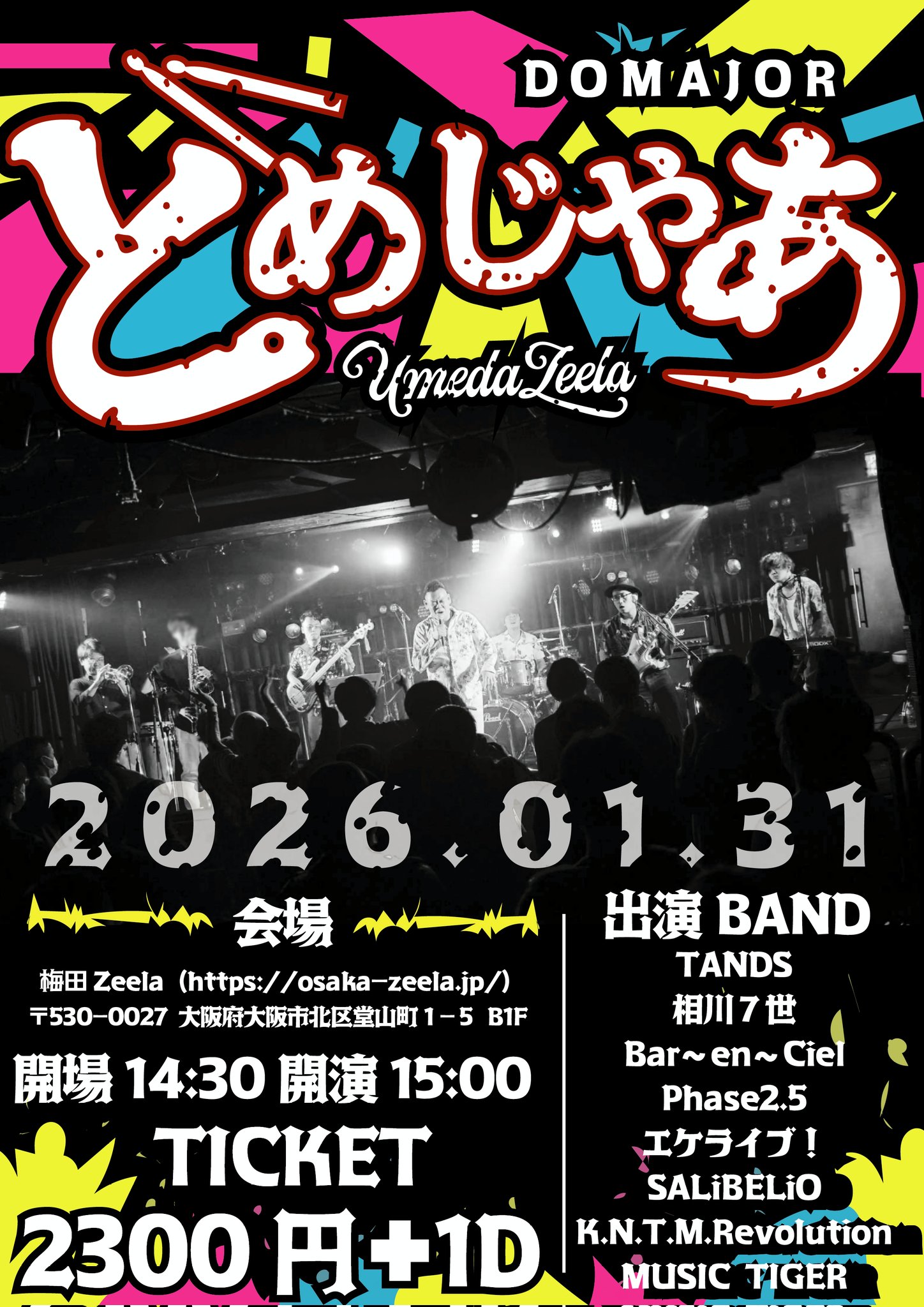 梅田 Zeela(ジーラ) スケジュール 2026.1.31(Sat) どめじゃあ [ACT] TANDS / 相川7世 / Bar~en~Ciel / Phase2.5 / エケライブ!/ SALiBELiO / K.N.T.M.Revolution / MUSIC TIGER [OPEN/START] 14:30/15:00 [料金] ADV/DOOR ¥2300/¥--- (問)梅田Zeela 06-6316-1199 http://osaka-zeela.jp