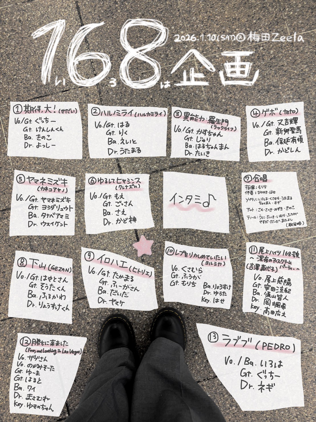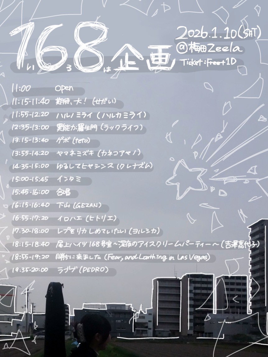 梅田 Zeela(ジーラ) スケジュール 2026.1.10(Sat) 168企画 [ACT] 期待、大! / ハルノミライ / 異能力:羅生門 / ゲボ / ヤマネミズキ / ゆるしてヒヤシンス / 下山 / イロハエ / レプをリカしめていたい / 尾上ハイツ168号室〜深夜のアイスクリームパーティ〜 / 勝ちに来ました / ラブブ [OPEN/START] 11:00/11:15 [料金] 無料(別途1drink代¥700必要) (問)梅田Zeela 06-6316-1199 http://osaka-zeela.jp