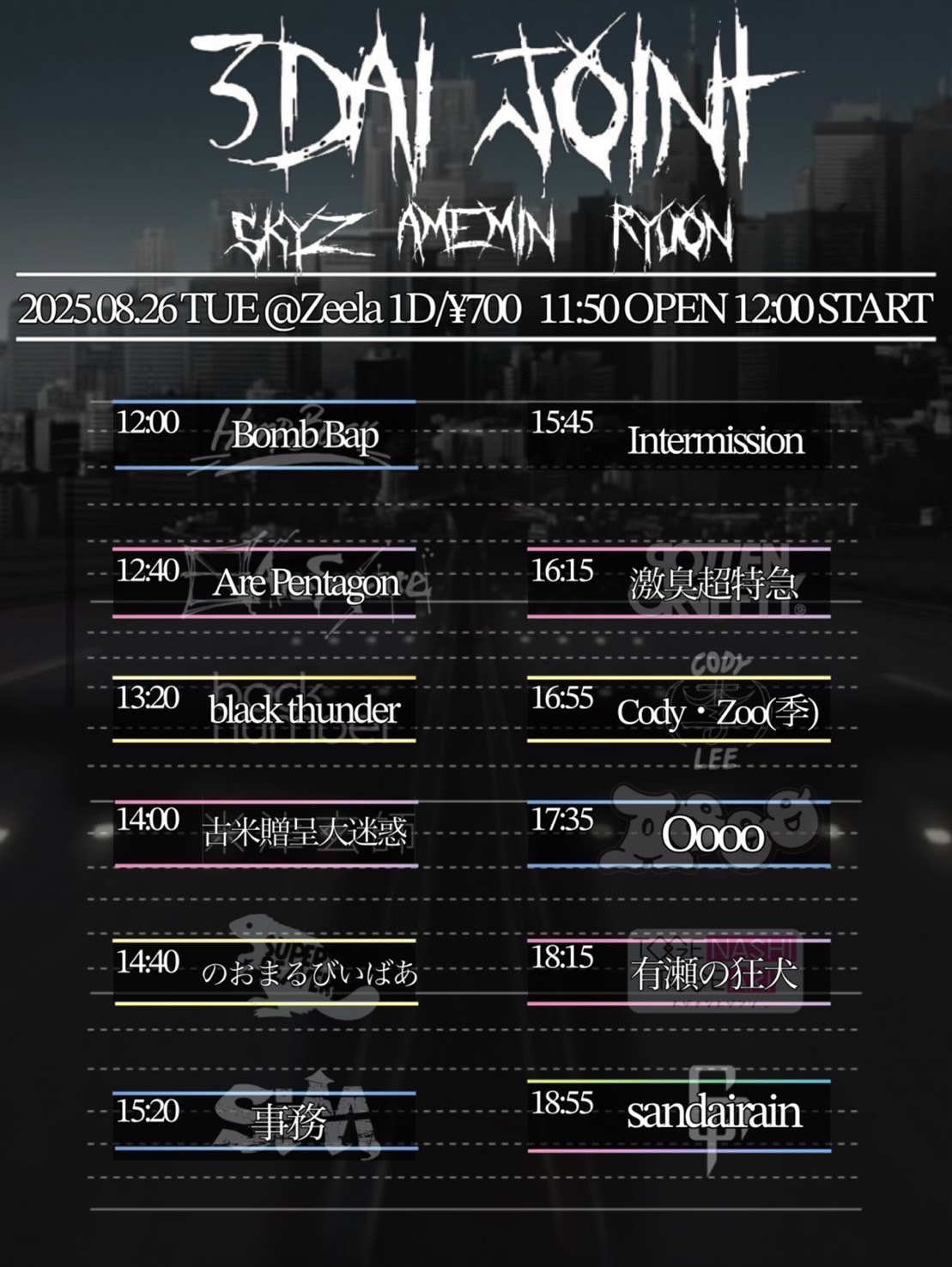 - Are Pentagon / black thunder / Bomb Bap / 古米贈呈大迷惑 / のおまるびいばあ / 事務 / 激臭超特急 / Cody・Zoo(季) / Oooo / 有瀬の狂犬 / Sandairain