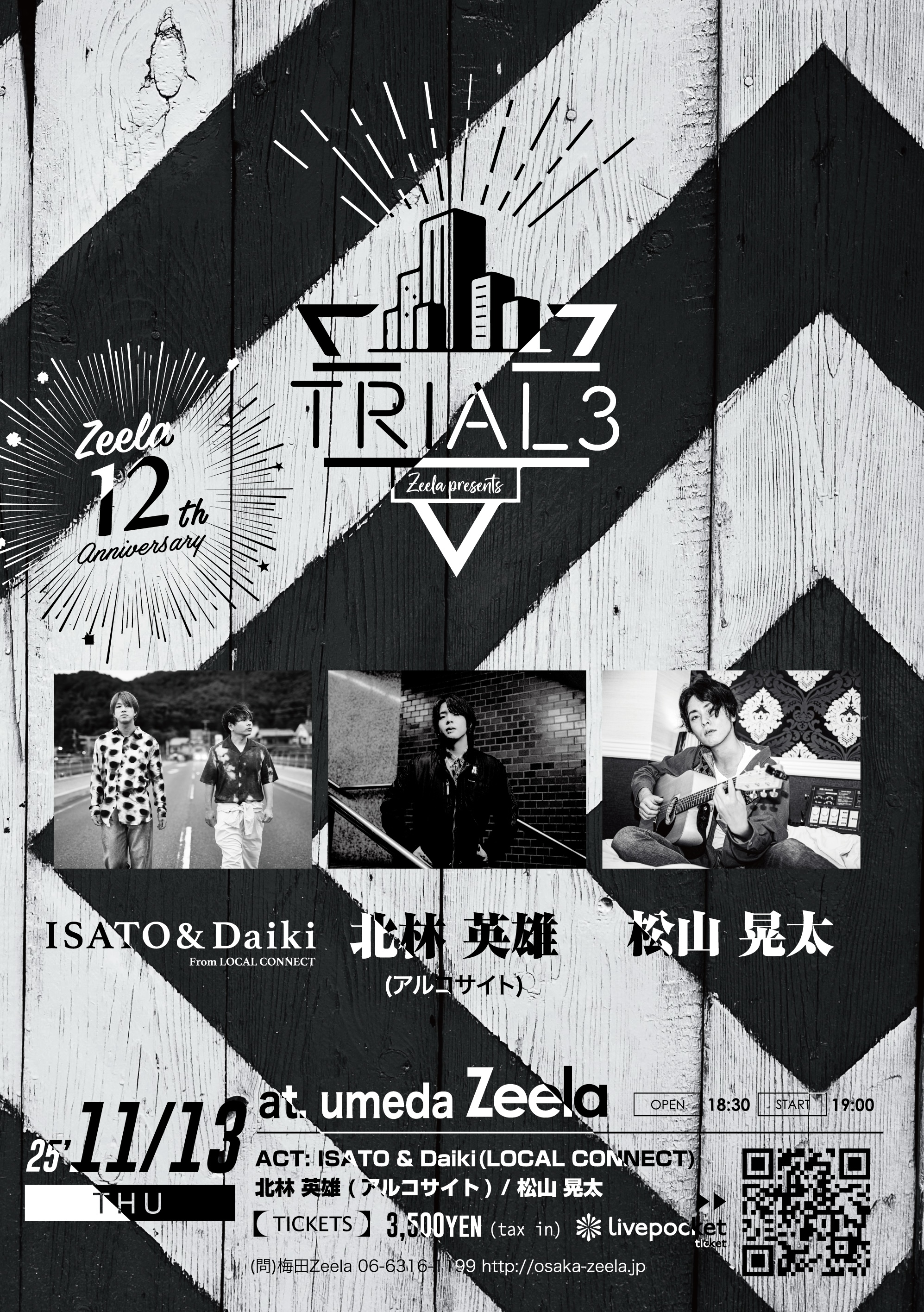 梅田 Zeela(ジーラ) スケジュール 2025.11.13(Thu) Zeela12周年記念スリーマンLIVE "TRIAL3" Day.3 [ACT] ISATO & Daiki(LOCAL CONNECT) / 北林 英雄(アルコサイト) / 松山 晃太 [OPEN/START] 18:30/19:00 [料金] ADV/DOOR ¥3500/¥--- (問)梅田Zeela 06-6316-1199 http://osaka-zeela.jp