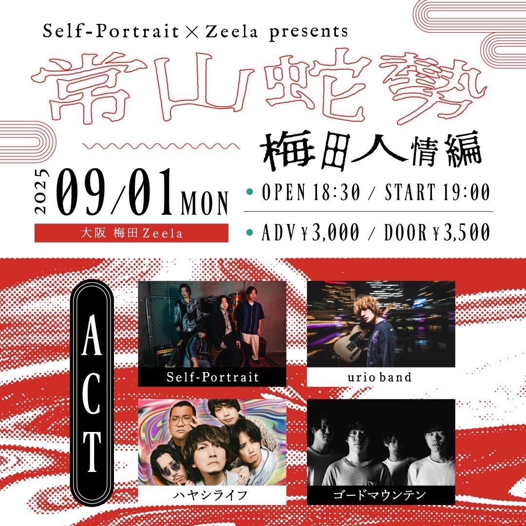 梅田 Zeela(ジーラ) スケジュール 2025.9.01(Mon) Self-Portrait × Zeela presents 「常山蛇勢-梅田人情編-」 [ACT] Self-Portrait / urio band / ハヤシライフ / ゴードマウンテン [OPEN/START] 18:30/19:00 (当初より変更しております) [料金] ADV/DOOR ¥3000/¥3500 (問)梅田Zeela 06-6316-1199 http://osaka-zeela.jp
