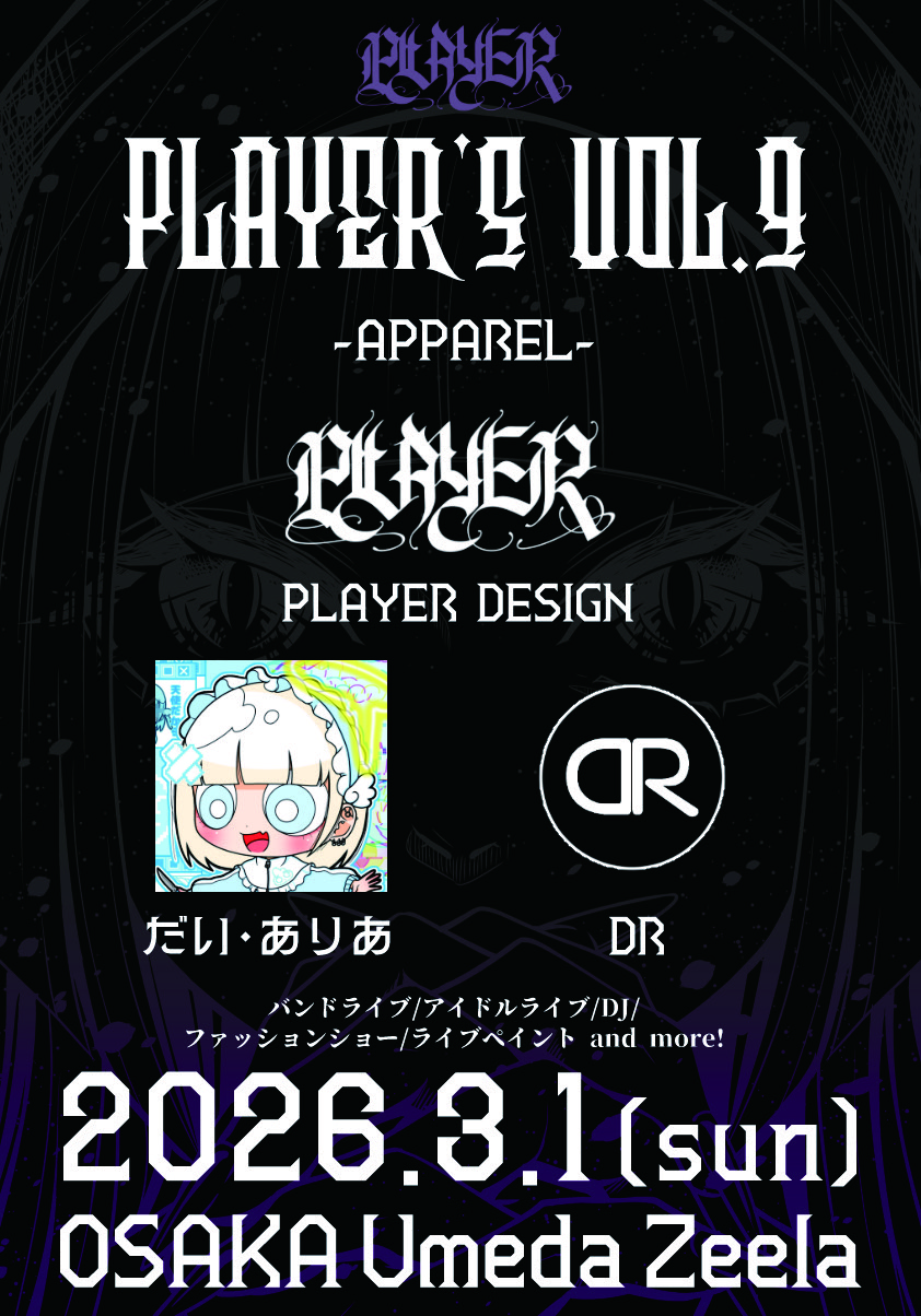 梅田 Zeela(ジーラ) スケジュール 2026.3.01(Sun) PLAYER'S VOL.9 [ACT] バンドライブ / アイドルライブ / DJ / ファッションショー / ライブペイント / and more! [OPEN/START] 14:30/15:00 [料金] ADV/DOOR ¥4000/¥5000 チケットのお求めはこちら https://livepocket.jp/e/players9 (問)梅田Zeela 06-6316-1199 http://osaka-zeela.jp