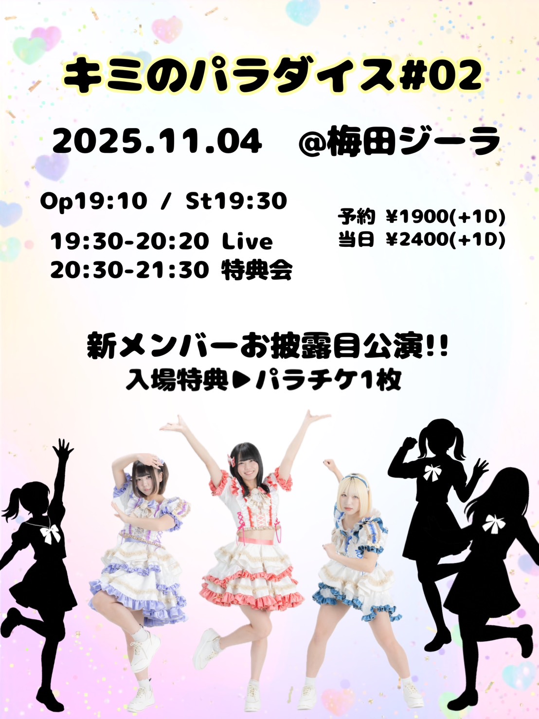 梅田 Zeela(ジーラ) スケジュール 2025.11.04(Tue) キミのパラダイス♡ #02 [ACT] ParaMilia [OPEN/START] 19:10/19:30 [料金] ADV/DOOR ¥1900/¥2400 チケットのお求めはこちら https://tiget.net/events/439137 (問)梅田Zeela 06-6316-1199 http://osaka-zeela.jp
