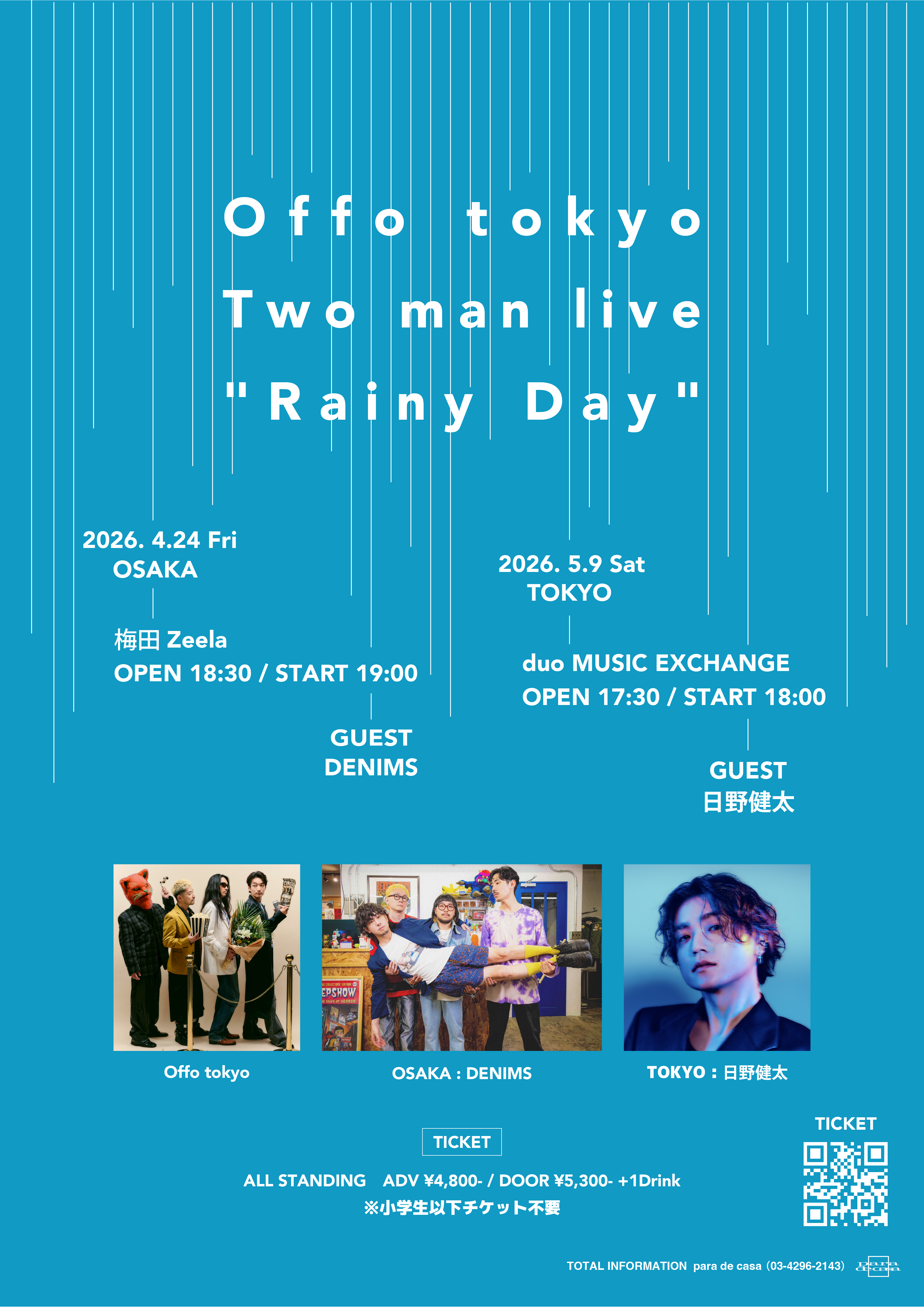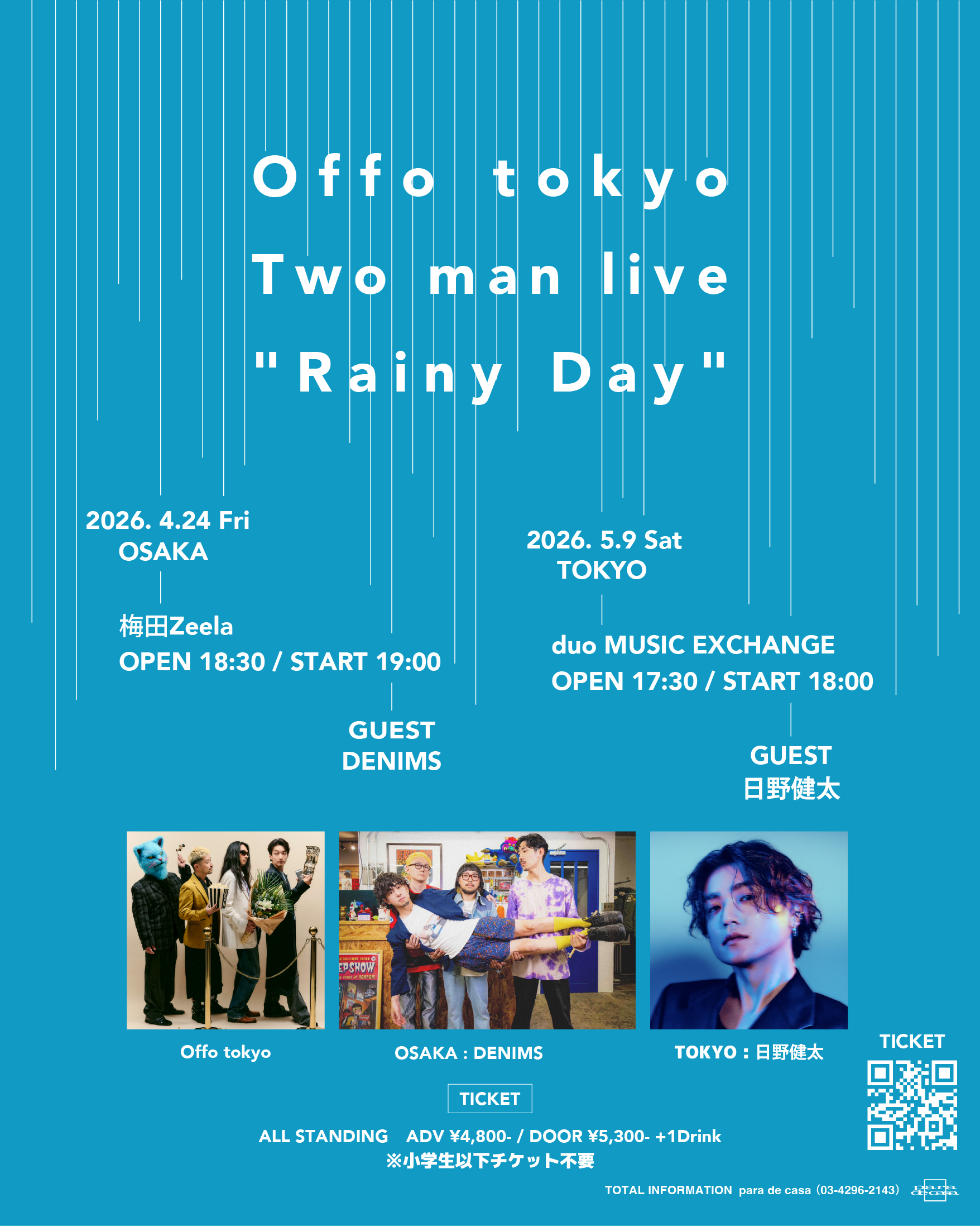 梅田 Zeela(ジーラ) スケジュール 2026.4.24(Fri) Offo tokyo Two man live"Rainy Day" -OSAKA- [ACT] Offo tokyo / DENIMS [OPEN/START] 18:30/19:00 [料金] ADV/DOOR ¥4,800/¥5,300 ※小学生以下チケット不要 (問)para de casa:para.de.casa@gmail.com
