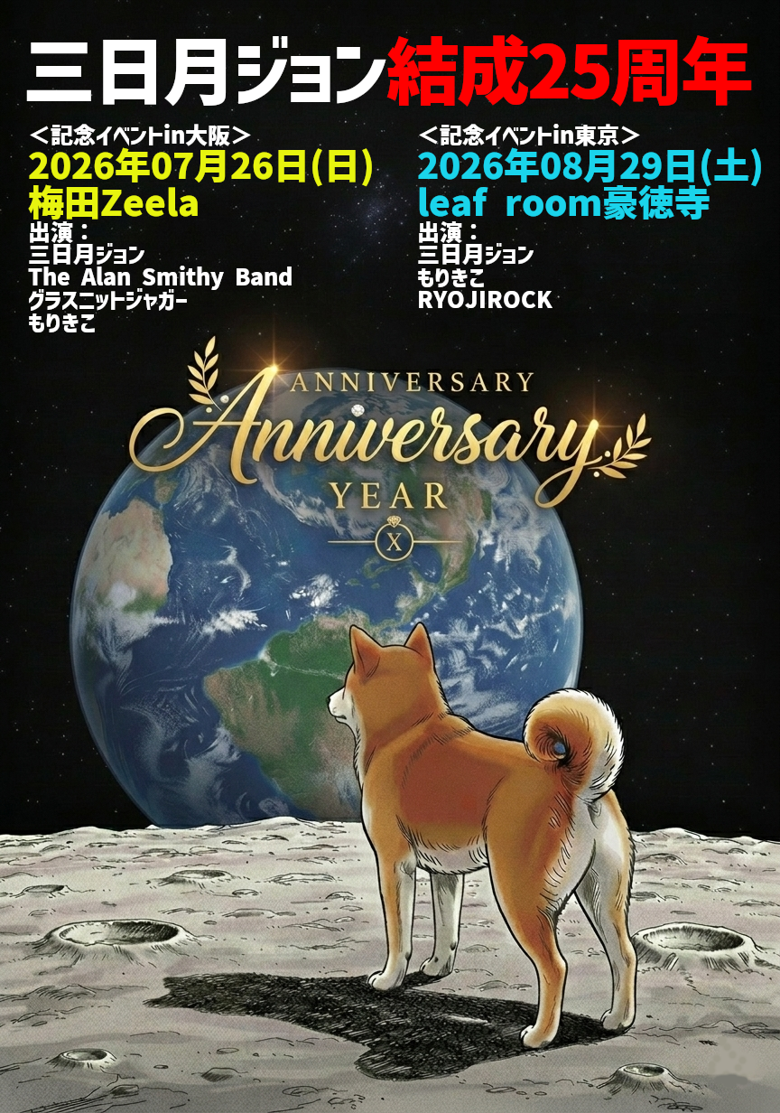 梅田 Zeela(ジーラ) スケジュール 2026.7.26(Sun) 三日月ジョン 結成25周年<記念イベントin大阪> [ACT] 三日月ジョン / The Alan Smithy Band / グラスニットジャガー / もりきこ [OPEN/START] ----/---- [料金] ADV/DOOR ¥---/¥--- (問)梅田Zeela 06-6316-1199 http://osaka-zeela.jp