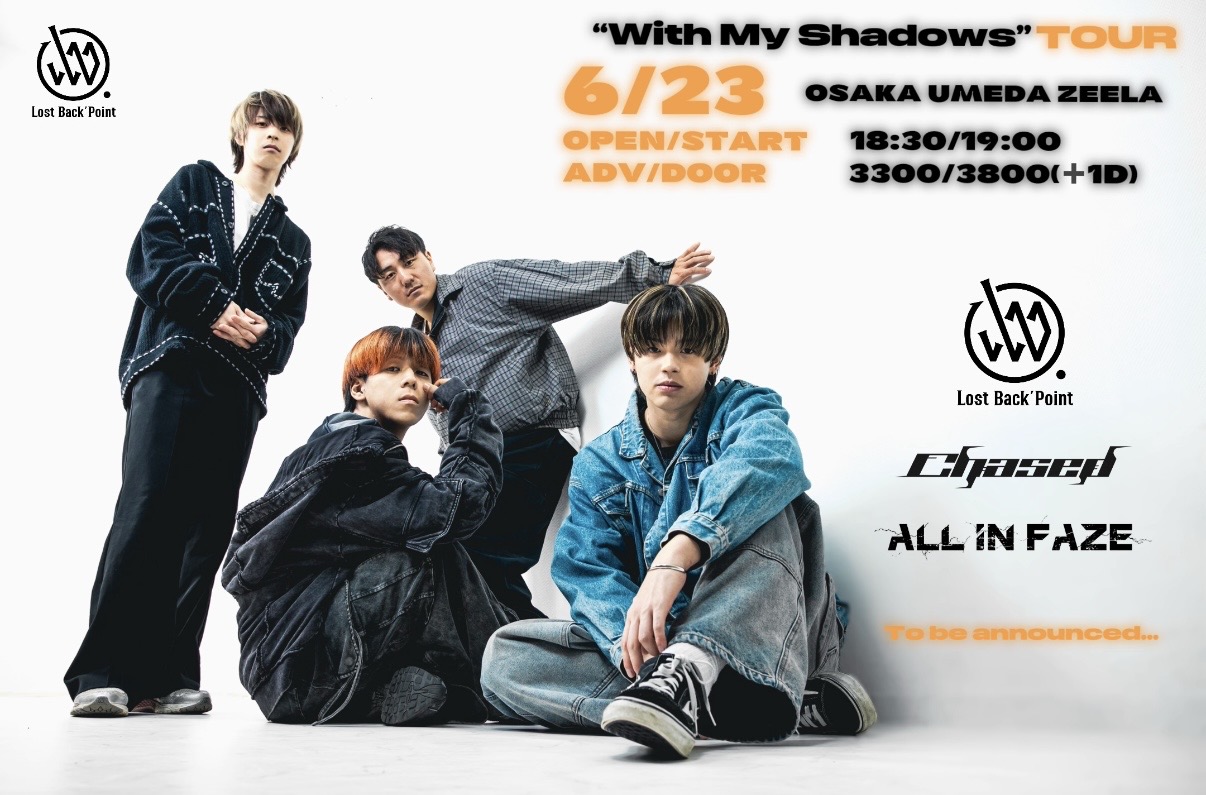 梅田 Zeela(ジーラ) スケジュール 2026.6.23(Tue) Lost Back’Point“With My Shadows” tour [ACT] Lost Back’Point / CHASED / ALL iN FAZE [OPEN/START] 18:30/19:00 [料金] ADV/DOOR ¥3,300/¥3,800 チケット: https://livepocket.jp/e/withmyshadowstour (問)梅田Zeela 06-6316-1199 http://osaka-zeela.jp
