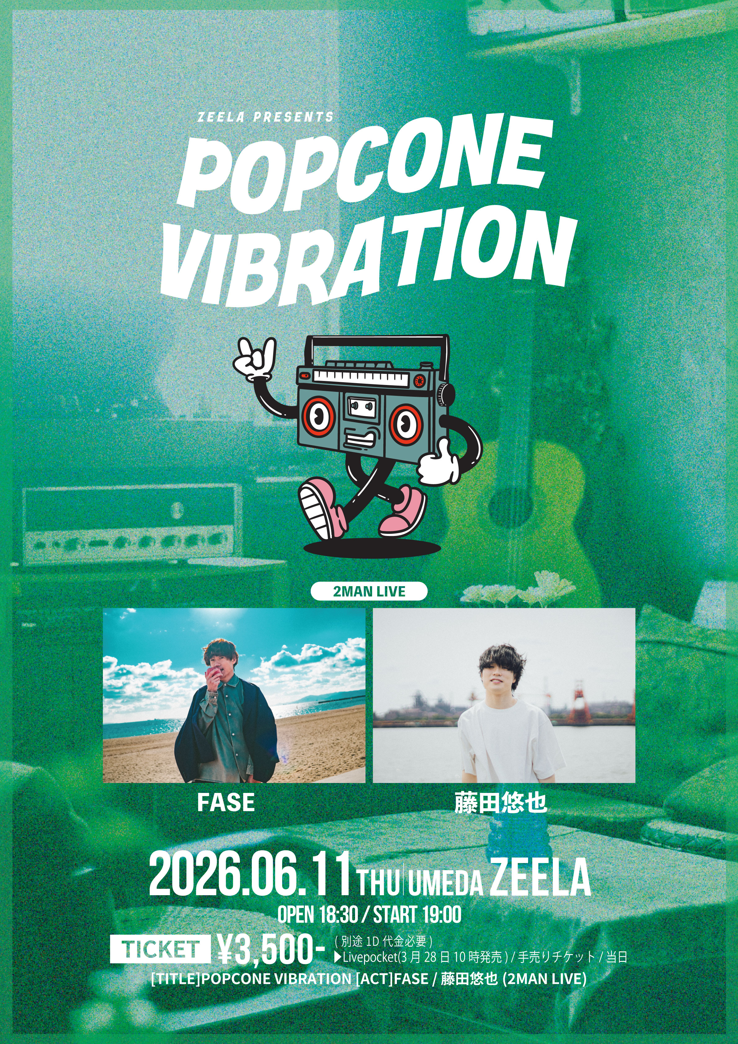 梅田 Zeela(ジーラ) スケジュール 2026.6.11(Thu) Zeela presents.POPCONE VIBRATION [ACT] FASE / 藤田悠也 [OPEN/START] 18:30/19:00 [料金] ADV/DOOR ¥3500/¥--- https://livepocket.jp/e/0_-oy (問)梅田Zeela 06-6316-1199 http://osaka-zeela.jp