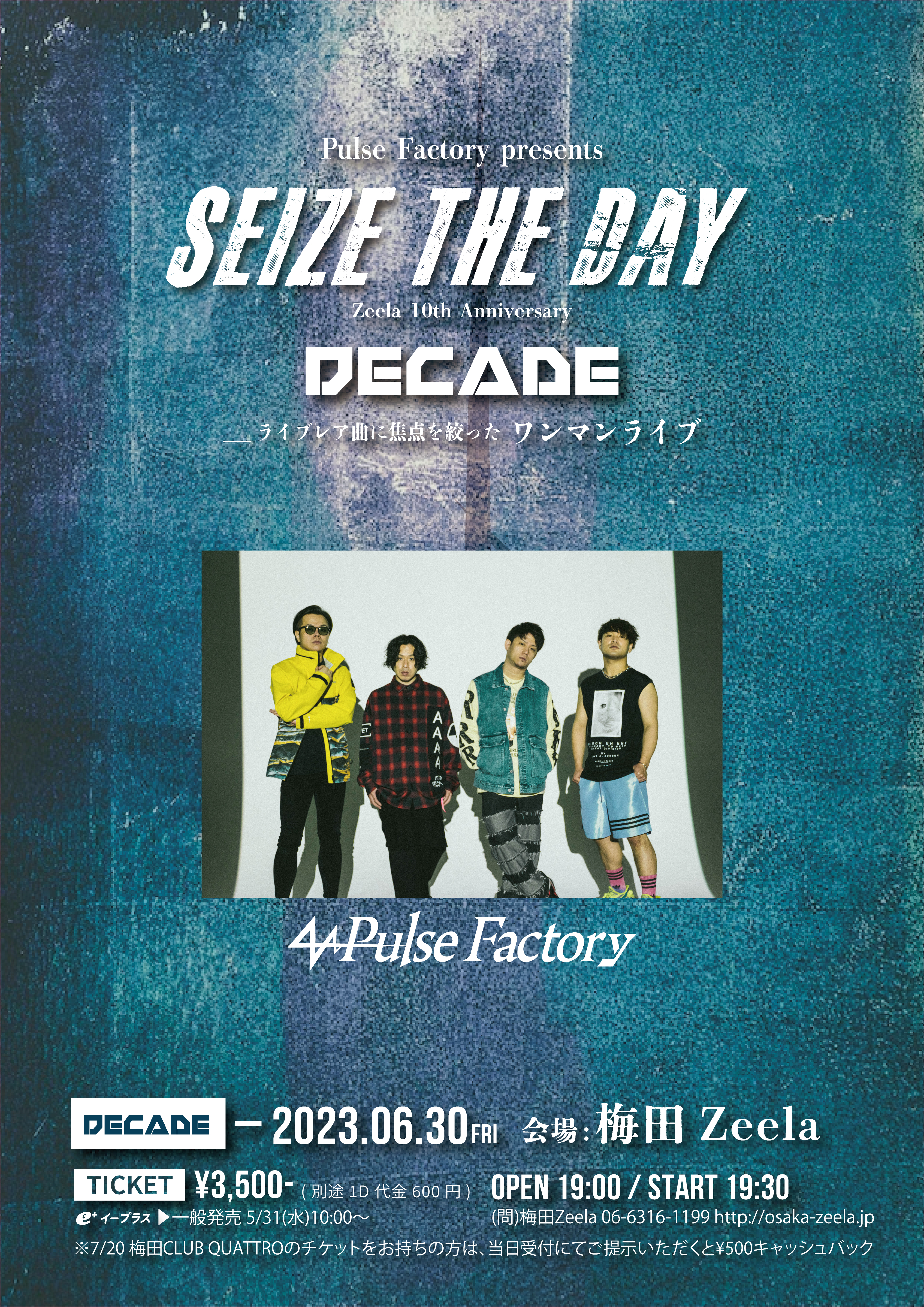 梅田 Zeela(ジーラ) スケジュール 2023.6.30(Fri) Pulse Factory presents SEIZE THE DAY "Decade"〜Zeela10周年100番勝負〜 [ACT] Pulse Factory [OPEN/START] OPEN/START 19:00/19:30 [料金] ADV/DOOR ¥3500/¥--- (問)梅田Zeela 06-6316-1199 http://osaka-zeela.jp
