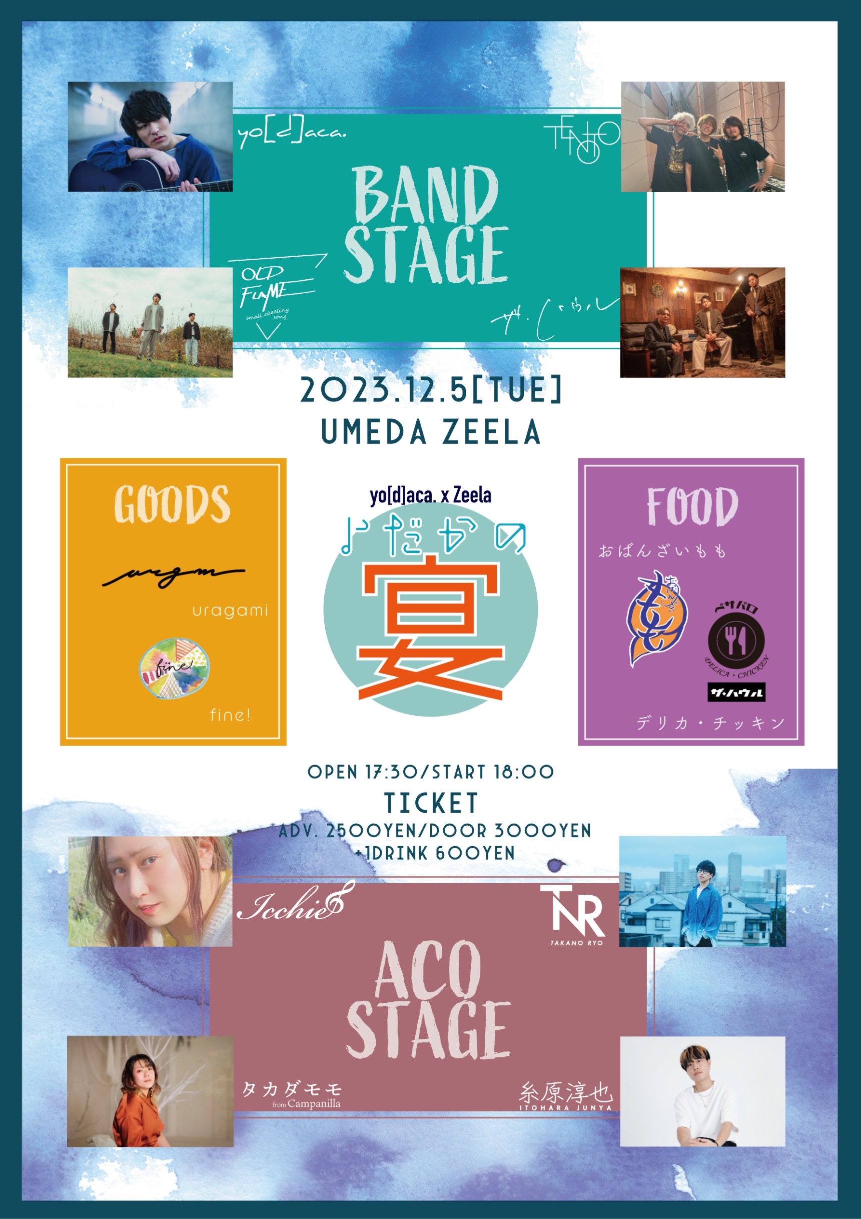 - [BAND STAGE] yo[d]aca. / tenoto / oldflame / ザ・ハウル / [ACO STAGE] Icchie / 髙野稜 / タカダモモ (from Campanilla) / [GOODS] uragami / fine! / [FOOD] おばんざいもも / デリカ・チッキン / ※ 出演予定の糸原淳也は体調不良によりキャンセルになりました。