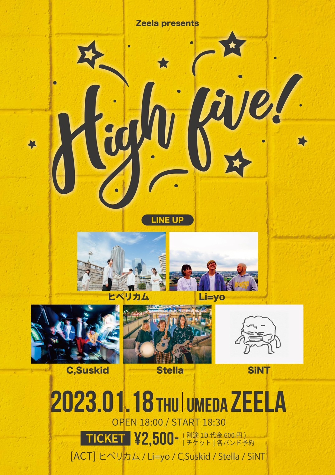 梅田 Zeela(ジーラ) スケジュール 2024.1.18(Thu) Zeela presents "High five" [ACT] ヒペリカム / Li=yo / C,Suskid / Stella / SiNT [OPEN/START] OPEN/START 18:00/18:30 [料金] ADV/DOOR ¥2500/¥3000 (問)梅田Zeela 06-6316-1199 http://osaka-zeela.jp