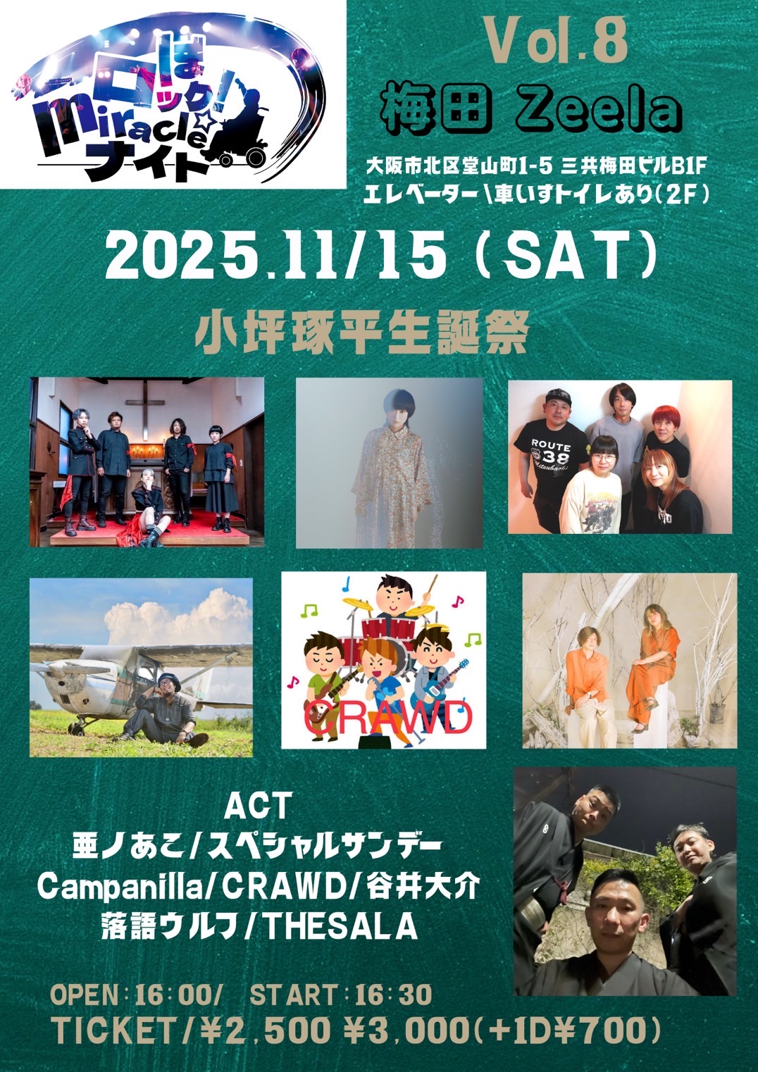 梅田 Zeela(ジーラ) スケジュール 2025.11.15(Sat) つぼロックmiracle★ナイトvol.8 小坪琢平生誕祭 -Zeela 12th ANNIVERSARY- [ACT] 亜ノあこ / スペシャルサンデー / Campanilla / CRAWD / 谷井大介 / 落語ウルフ / THE SALA [OPEN/START] 16:00/16:30 [料金] ADV/DOOR ¥2500/¥3000 (問)梅田Zeela 06-6316-1199 http://osaka-zeela.jp