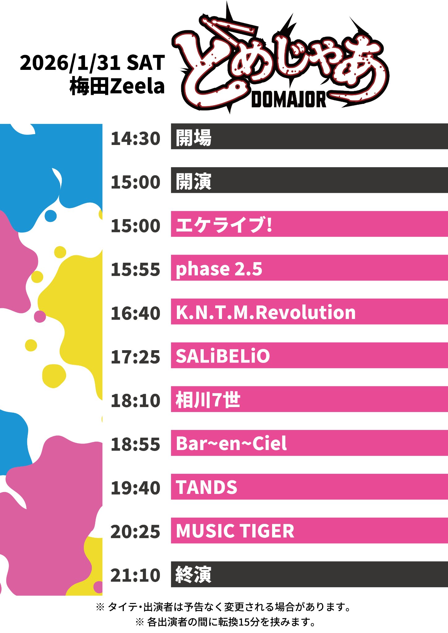 梅田 Zeela(ジーラ) スケジュール 2026.1.31(Sat) どめじゃあ [ACT] TANDS / 相川7世 / Bar~en~Ciel / Phase2.5 / エケライブ!/ SALiBELiO / K.N.T.M.Revolution / MUSIC TIGER [OPEN/START] 14:30/15:00 [料金] ADV/DOOR ¥2300/¥--- (問)梅田Zeela 06-6316-1199 http://osaka-zeela.jp