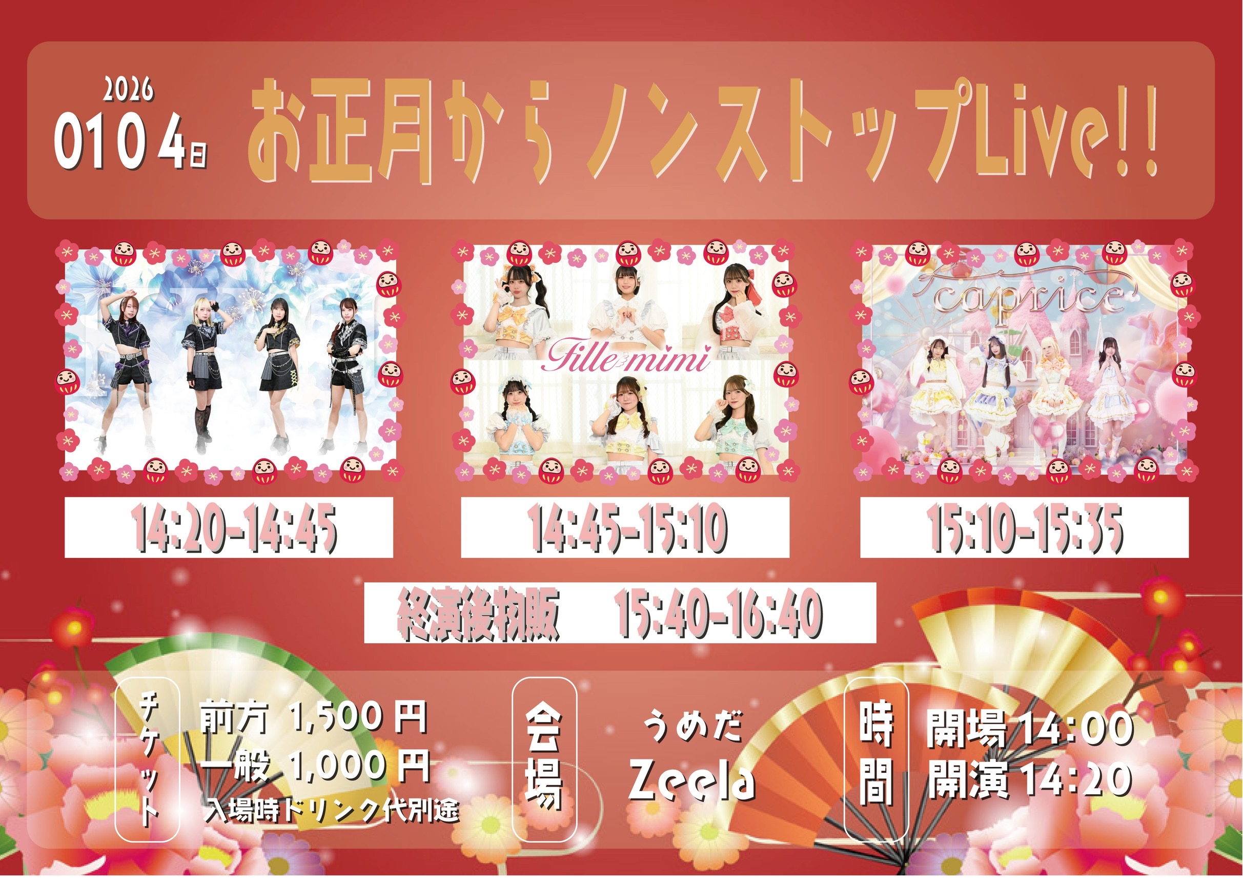 梅田 Zeela(ジーラ) スケジュール 2026.1.04(Sun) お正月からノンストップ25分LIVE [ACT] Fille mimi / caprice / キミだけの花言葉 [OPEN/START] 14:00/14:20 [料金] 前方1500円 /一般 1000円 (問)梅田Zeela 06-6316-1199 http://osaka-zeela.jp