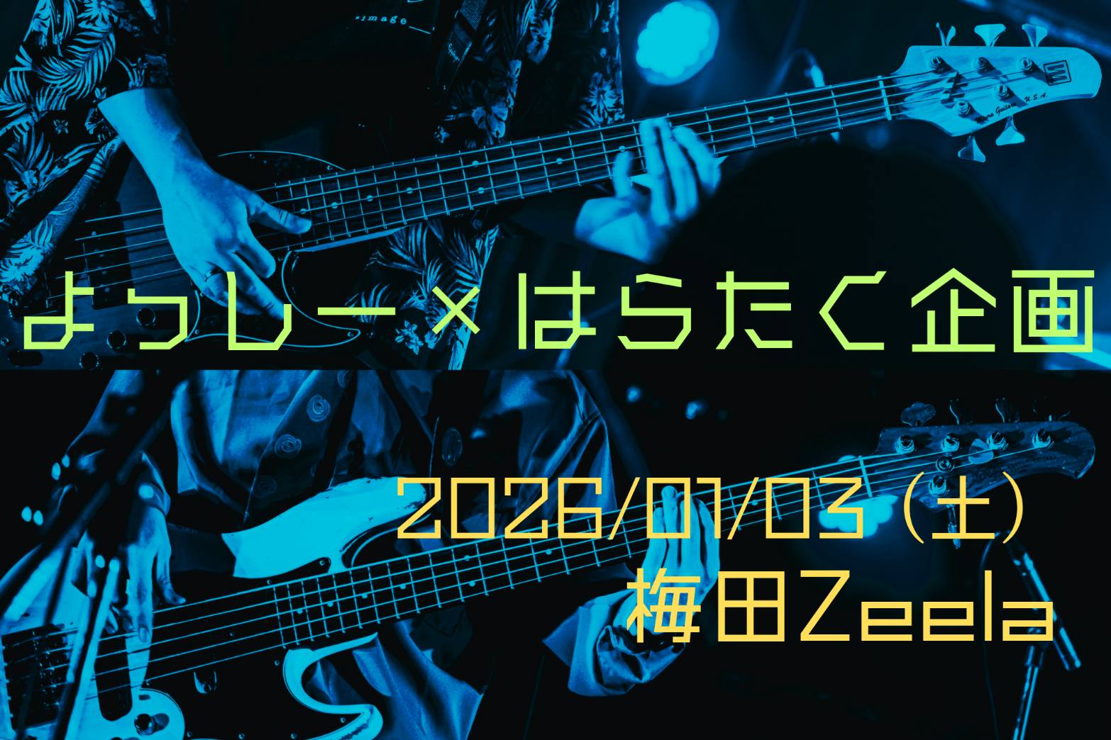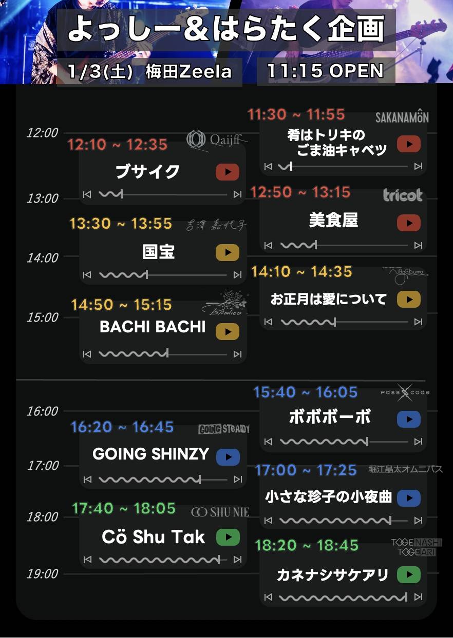 梅田 Zeela(ジーラ) スケジュール 2026.1.03(Sat) よっしー × はらたく企画 [ACT] 肴はトリキのごま油キャベツ / ブサイク / 美食屋 / 国宝 / お正月は愛について / BACHI BACHI / ボボボーボ / GOING SHINZY / 小さな珍子の小夜曲 / Cö Shu Tak / カネナシサケアリ [OPEN/START] 11:15/11:30 [料金] FREE (1D代別) (問)梅田Zeela 06-6316-1199 http://osaka-zeela.jp