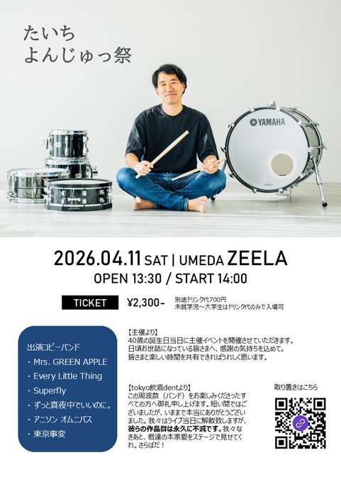 梅田 Zeela(ジーラ) スケジュール 2026.4.11(Sat) たいちよんじゅっ祭 [ACT] みどリンゴ / R.I.P / スーパーマルイ / えびまよ。 / たいちくん誕おめ祝隊 / tokyo飲酒dent [OPEN/START] 13:30/14:00 [料金] ADV/DOOR ¥2300/¥--- (問)梅田Zeela 06-6316-1199 http://osaka-zeela.jp