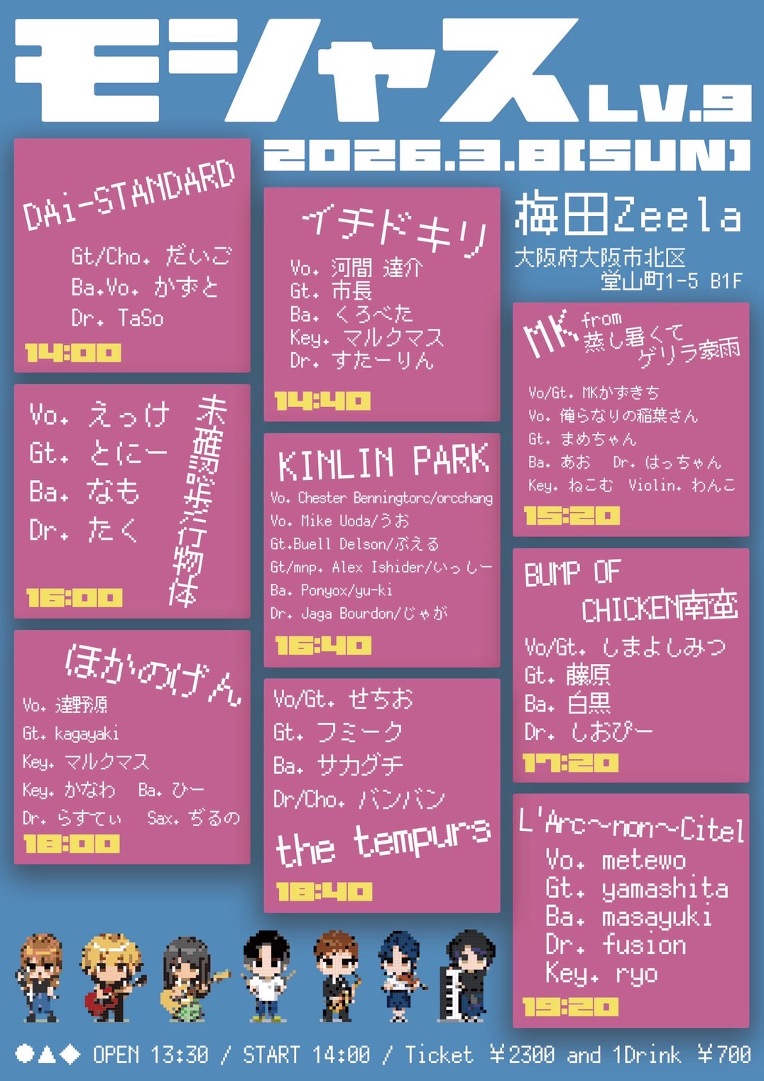 梅田 Zeela(ジーラ) スケジュール 2026.3.08(Sun) モシャス Lv.9 [ACT] DAi-STANDARD / イチドキリ / MK from 蒸し暑くてゲリラ豪雨 / 未確認歩行物体 / KINLIN PARK / BUMP OF CHICKEN南蛮 / ほかのげん / the tempurs / L'Arc~non~Citel [OPEN/START] 13:30/14:00 [料金] ADV/DOOR ¥2300/¥2300 (問)梅田Zeela 06-6316-1199 http://osaka-zeela.jp