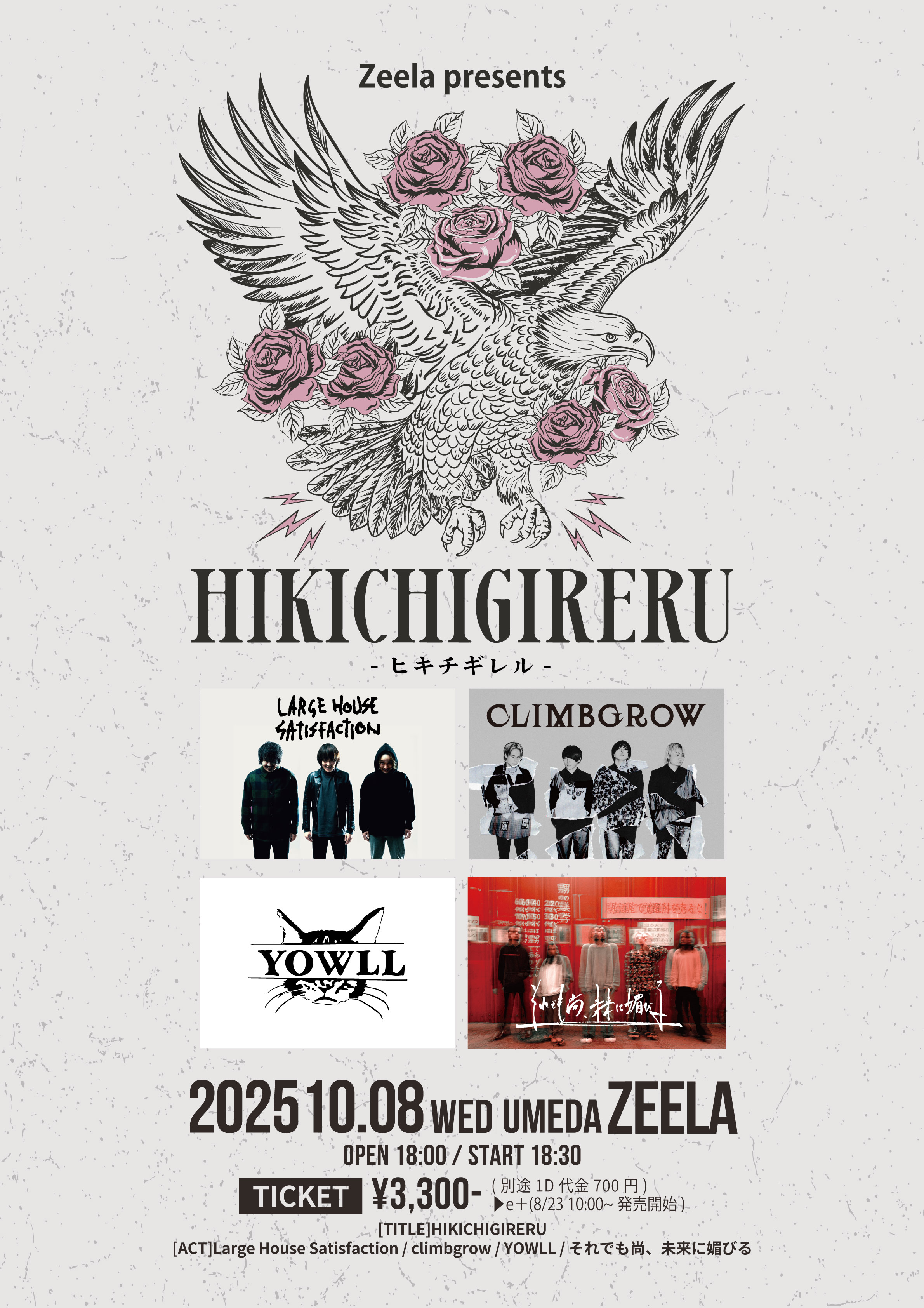 梅田 Zeela(ジーラ) スケジュール 2025.10.08(Wed) Zeela presents "HIKICHIGIRERU" [ACT] Large House Satisfaction / climbgrow / YOWLL / それでも尚、未来に媚びる [OPEN/START] 18:00/18:30 [料金] ADV/DOOR ¥3,300/¥3800 (問)梅田Zeela 06-6316-1199 http://osaka-zeela.jp