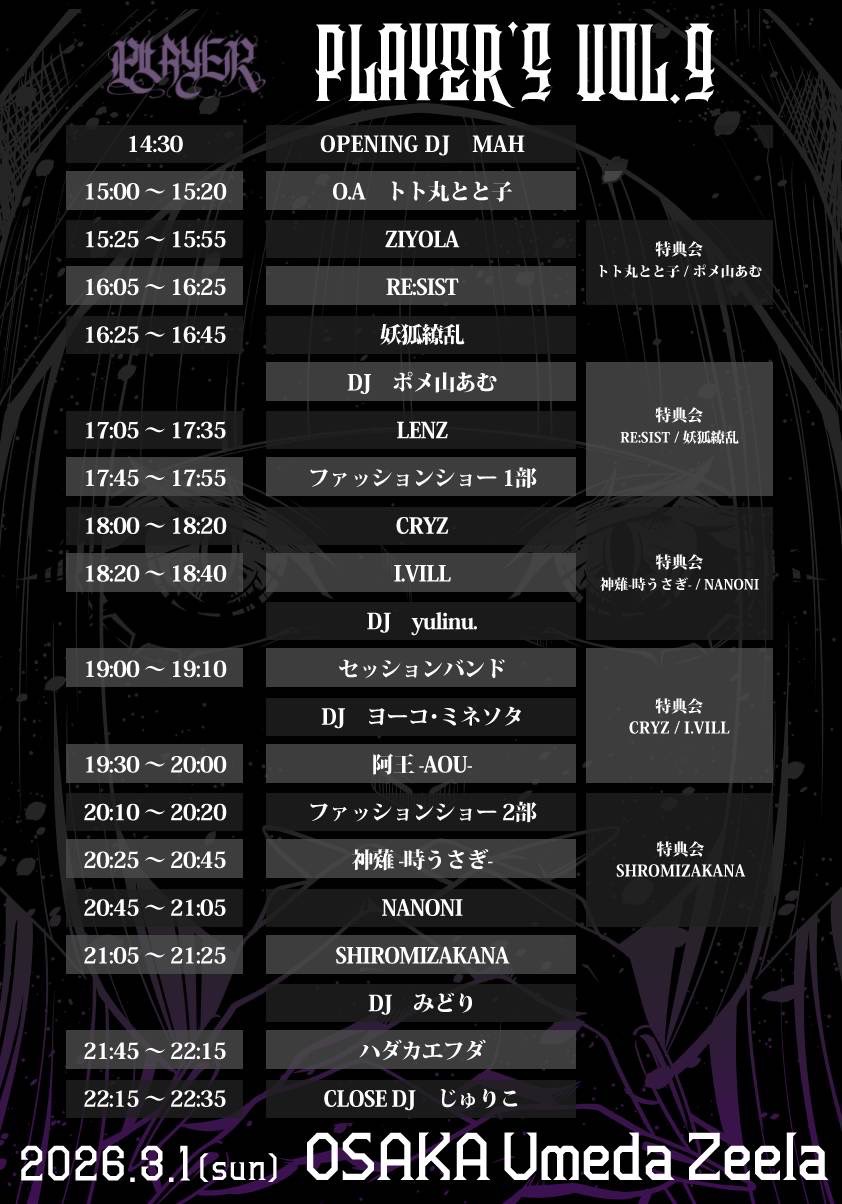 - [BAND] LENZ / ハダカエフダ / ZIYOLA / 阿王-AOU- / [IDOL] SHIROMIZAKANA / 神薙-時うさぎ- / NANONI / 妖狐繚乱 / I.VILL / RE:SIST / [DJ] じゅりこ / ポメ山あむ / MAH(PLAYER) / みどり / yulinu. / ヨーコ・ミネソタ / [SPECIAL GUEST]トト丸とと子 / [APPAREL] PLAYER DESIGN / だい・ありあ / DR / [LIVE PAINT] だい・ありあ / ねむすけ(PLAYER) / [FOOD] DRINK OR DIE / [TEQUILA GIRL] 招猫飯店 / ※出演予定のCRYZはキャンセルとなりました。