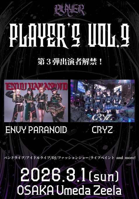 - [BAND] LENZ / ハダカエフダ / [IDOL] SHIROMIZAKANA / 神薙-時うさぎ- / ENVY PARANOID / CRYZ / [DJ] じゅりこ / ポメ山あむ / MAH(PLAYER) / みどり / yulinu. / ヨーコ・ミネソタ / [APPAREL] PLAYER DESIGN / だい・ありあ / DR / and more!