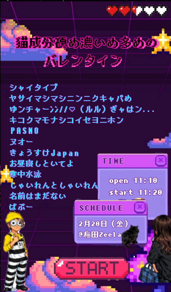 梅田 Zeela(ジーラ) スケジュール 2026.2.20(Fri) 猫成分硬め濃いめ多めのバレンタイン [ACT] シャイタイプ / ヤサイマシマシ / ゆンチャーン / キコクマモナシ / PASMO / しゃいれんとしゃいれん / お昼寝しといてよ / キョウスケJapan / ヌオー / 寒中水泳 / 名前はまだない / ばぶー [OPEN/START] 11:30/11:40 [料金] FREE(+1D¥700) (問)梅田Zeela 06-6316-1199 http://osaka-zeela.jp