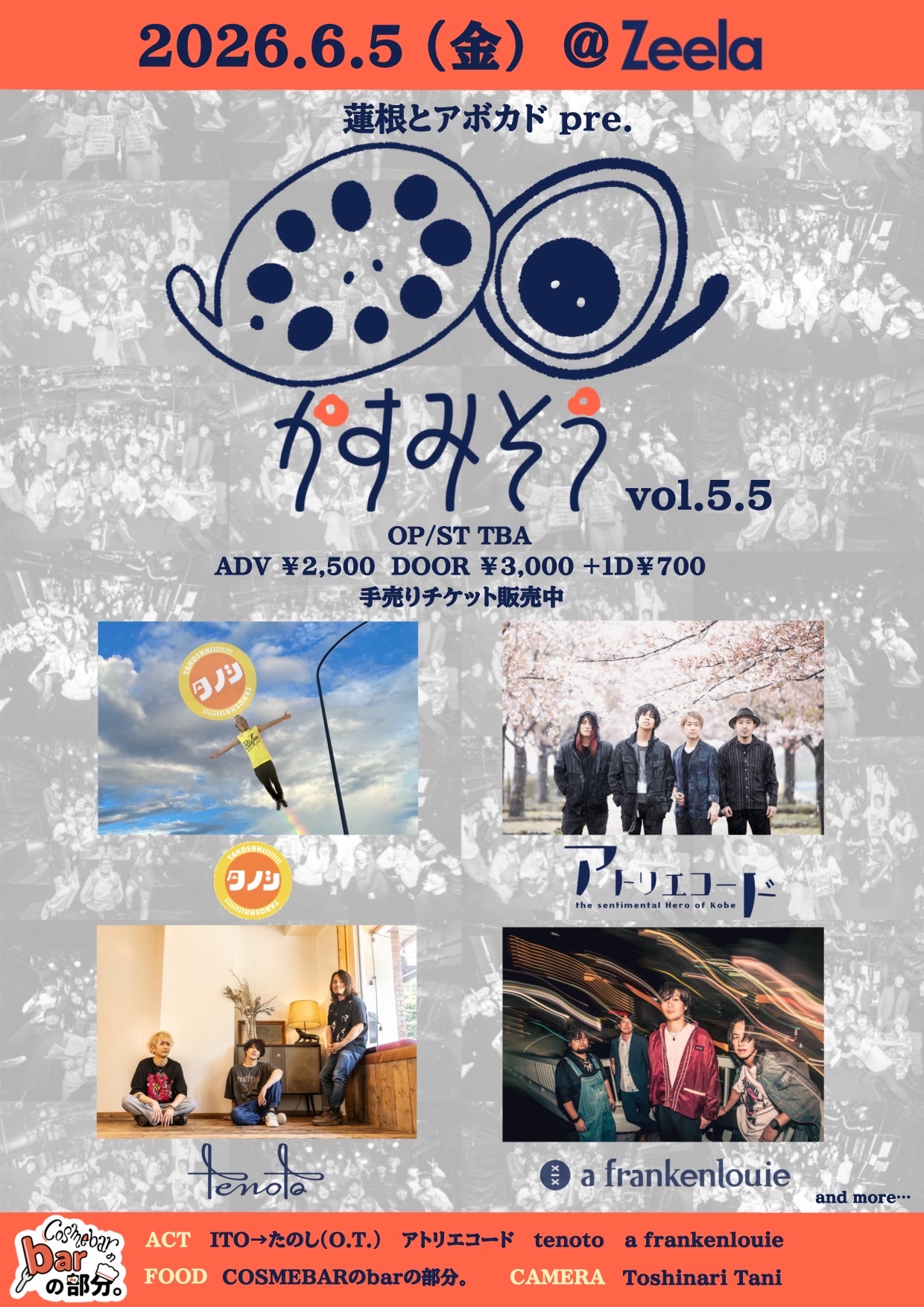 梅田 Zeela(ジーラ) スケジュール 2026.6.05(Fri) 蓮根とアボカドpre.かすみそう vol.5.5 [ACT] ITO→たのし / アトリエコード / tenoto / a frankenlouie / and more... [OPEN/START] TBA/TBA [料金] ADV/DOOR ¥2500/¥--- (問)梅田Zeela 06-6316-1199 http://osaka-zeela.jp