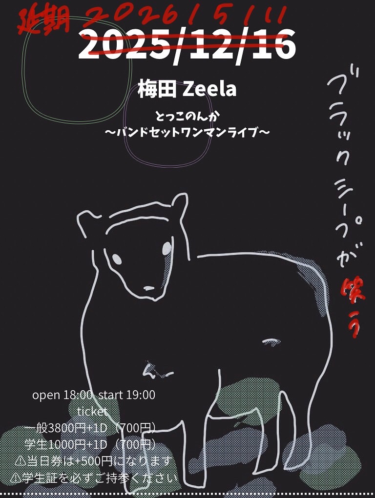 梅田 Zeela(ジーラ) スケジュール 2026.5.11(Mon) ブラックシープが笑う【延期公演】 [ACT] とっこのんか 〜バンドセットワンマンライブ〜 [OPEN/START] 18:00/19:00 [料金] 前売り:一般 ¥3800 / 学生 ¥1000 / 当日:一般 ¥4300 / 学生 ¥1500 ※学生証を必ずご持参ください Livepocket:https://livepocket.jp/e/sk8f1 (問)梅田Zeela 06-6316-1199 http://osaka-zeela.jp